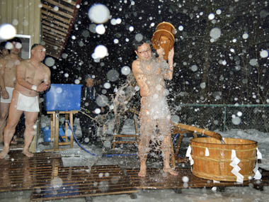 水垢離・・・ 裸参りに先立ち、水垢離をして身を清めます。総勢18名の男衆が雪降りの中で桶から水を汲み、「えいっ」という気合いをかけ頭から水をかぶります。 撮影している私たち(かなりの方が居りました)は、猛烈な雪降りになりカメラもレンズをびしょ濡れになりながらの撮影でした。ストロボの光が雪に吸い込まれ、大小様々な模様になりました。 |