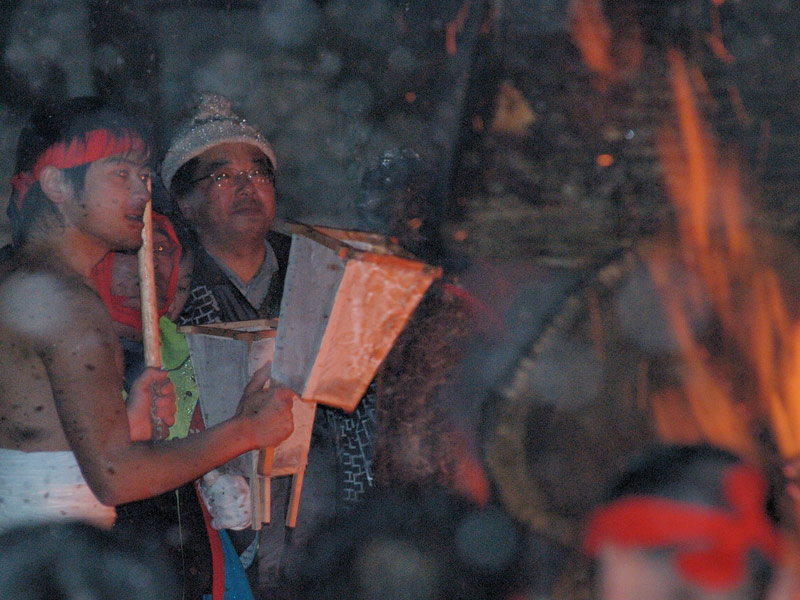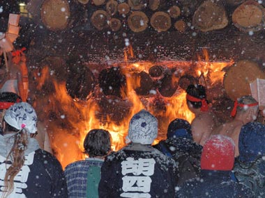 井桁状に組み上げた高さ3mを超すやぐら( 歳戸木 )は、着火しやすいように小枝や細い丸太(間伐材とのこと)が組み込まれています。点火するともの凄い勢いで燃え始めますが、30センチ以上もある杉の丸太には直ぐには燃え付きません。しばらくして下から火がまわり始めると、井桁状に組み上げた杉の丸太が本格的に燃え始めていきます。 |