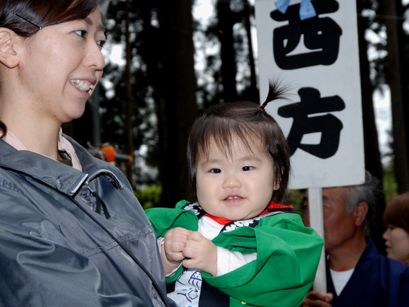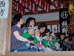 | 鳥居のある通路脇にエアーアーチがあり、神官の吹き鳴らすホラ貝の合図で東側の豆力士から参道に入ります。豆絞り姿の可愛い表情が印象的ですが、この時点から泣きだしているお子さんもあり、抱いているお母さん達は大変そうでした。 |