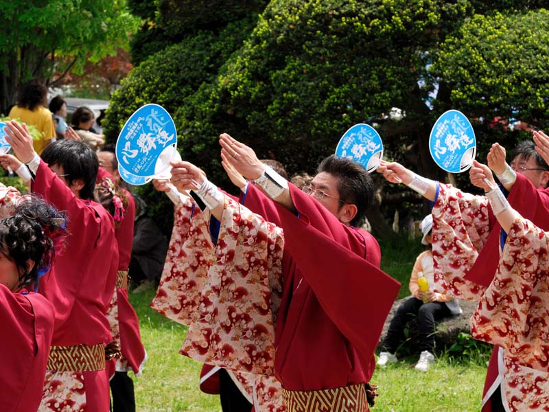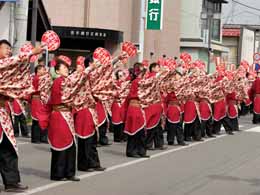 | 当日の運行予定表を見ながら、先回りをして場所をとりました。讃祥会の看板を掲げたトラックを先頭に、提灯と大きな幟を携えた男性群がやってきました。スピーカからは江刺甚句の曲が流れ、皆さんは手拍子をしながら和気藹々と行進しています。 8:40頃、この場所でリーダーから挨拶があり、江刺甚句踊りが披露されました。 |