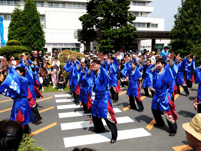 | 11:15頃、町内巡演は県立江刺病院前にやってきました。入院中の皆さんが見守る中、甚句踊りの披露がありました。本来ですと病院前の道路で全員が踊るのですが、緊急車両の出入りがあるとのことで、先頭の皆さんとその後ろの方々の踊る場所が離れました。 |
