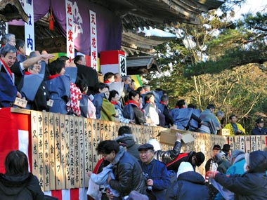 | 豆捲き・・・ 本堂前に造られたお立ち台と言いますか一段と高い場所に、中央に中尊寺貫首と主役の「高見盛関」、その両側に厄年・年男・年女の皆さんが整列します。列は二段あり、前列が女性の方、後列が男性の方となっています。それぞれ皆さんには、名前が書かれた大きな木製の升が配られ豆(落花生)が入っています。他所ではビニール袋に入っている様ですが、ここでは落花生そのものです。 豆撒きが始まる前に中尊寺貫首から挨拶がありました。 一言ご挨拶を申し上げます。本日の中尊寺恒例の節分会にお出でを頂きましてまことにありがとうございます。ご存知の通り、節分は暦の上で冬が終わって春が来る、その前日の日のことでございます。 この時にあたって、一年間色々犯してきた罪をさんげし、そして、溜まったわだかまりを全部捨て去って、清々しい心と身体をもって、その功徳によって身体健康、家内安全、そして五穀豊穣を祈る。そして沢山の幸福を得ようという催しでございます。 どうぞ今までありました苦しみや悲しみを全部投げ捨てて、沢山の幸せをお持ち帰り下さいますよう、ただ今から豆撒きを高見盛関をお迎えして行います。(※会場での記録から) |