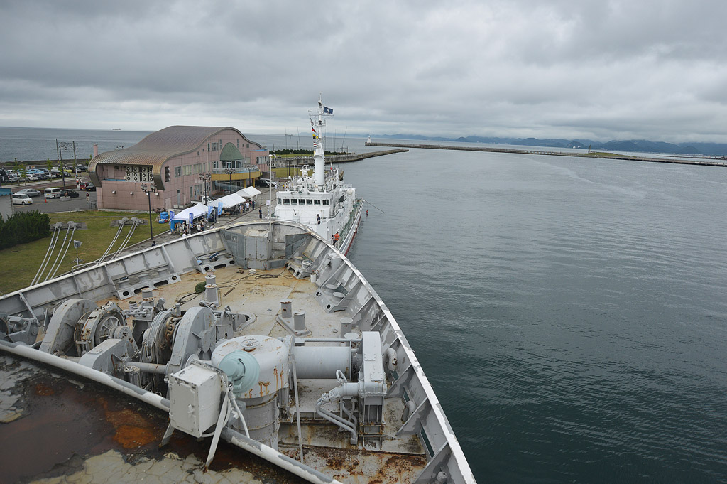 | 係留されている岸壁・・・ 青森港の一角、以前の連絡船乗り場付近にメモリアルシップ八甲田丸が係留されています。全長が132m、全幅18m、吃水下1階、水面上4階、総トン数5,382トンの連絡船です。たまたまでしたが、船首の方向に海上保安庁の巡視船が停泊していましたが、大きさは大人と子どもの違いでした。 |