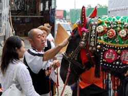 | 神社前の広場は、多くの馬達が家族に手伝ってもらって装いの最中でした。各地から馬を運んできた大型トラックがならび、無心に餌を食べている馬もありますし、順序よく色々な装束を身につけている馬もありました。境内では、子ども達による滝沢駒踊りが奉納されていました。 装い・・・ 「チャグチャグ」とは、馬コの首つるした大きな鳴輪(なりわ)と葬具につけられた大小の鈴が奏でる協和音を表しています。祭り当日は、早朝から家族総出で馬具や装束の取り付けが始まります。その順序には一定のしきたりがあります。最初に鞍を着けて二布ぶとんをかけ、結わえ上げて腹部を包み込みます。続いて真鍮製の鳴輪、むながい、しりがい、首よろい、まびさし、鼻かくし、耳袋と進みます。はづな、花模様の「まんじゅう」がついたおもがいなども取り付けられ、最後に吹き流しと呼ぶ垂れ布をさげます。これらの装束は古式防具の名残をとどめているといわれ、民俗学的にも貴重です。 装束の配色はそれぞれの家で趣向が凝らされ、金具や鞍などをのぞき、昔ながらに家族の手で丹精こめてつくられます。チャグチャグ馬コは手作りの祭りでもあるのです。 (滝沢村観光協会編集の「南部盛岡 チャグチャグ馬コの記」より) |