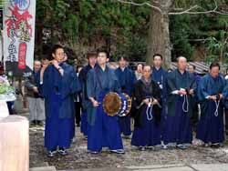 この画像は、神楽衆が笛を吹き、太鼓・鉦を打ち鳴らしながら参道を登ってくる様子です。時刻は午後2時ですが、杉の木が立ち並ぶ参道で暗い場面でした。軽やかな笛の音と、軽快なリズムの太鼓と鉦の音が、心にしみこんでくる雰囲気でした。