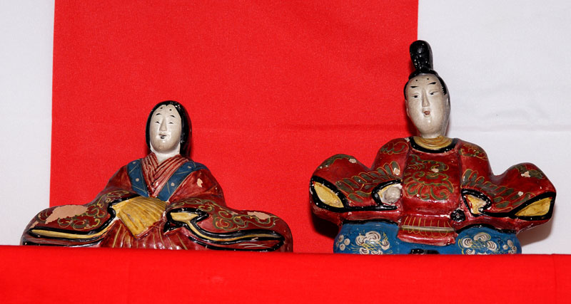 | 雛人形のことは良く分からないのですが、画像を見ていて気がついた事がありました。撮影した場所によってお内裏様の位置が違うことでした。ここでは殿様が右、お姫様が左になっています。上段が新しいもので、下段が古いものになります。顔の形はそれほど違わないように見えたのですが・・。 人形の表情は一見すると同じに見えますが、よく見るとそれぞれに違いがあります。塗料が取れかかったところがありますが、塗料に使われているのが膠(にかわ)なので虫が付きやすいとのことでした。 |