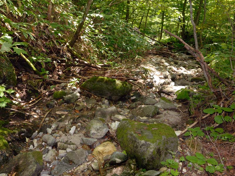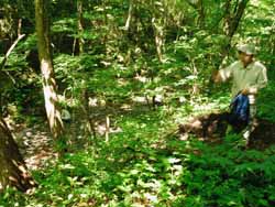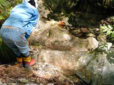 | 第4流入口にて・・ 上の方に水が流れています。そこで消えています。下流には全然流れていません。この水は水量によってしみ込む地点が違います。100m位上下します。ここら辺の川底にフィルターのようなしみ込むところがあります。 水温と電気伝導度を測っています。電気を通す、電気伝導度が大きければ大きいほどイオンがいっぱいあると言うことが分かります。ここより下には普段水は流れていません。洪水とか雪解けの時期になりますと、水が多くなって長内沢の入口付近まで流れることがありますが、それはまれです。電気伝導度が30.4、水温が19度。これがこれから先どう変化するか見ていきたいと思います。 緑一杯の林の中で撮影するのは大変でした。画面が緑のフィルターをかけたようになり、自然の色が出ないのです。木漏れ日があり、かなり不自然ですがお許し下さい。 |