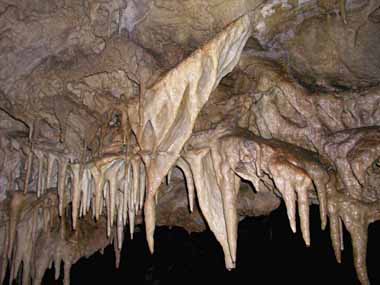 | 坪沢穴の洞口の標高は、氷渡洞の洞口よりおよそ80m高い位置にあります。石灰岩の山肌に、ぽっかりと開いている穴の上には鉄骨が置かれ、そこから下に降下するためのロープが見えています。この穴から35m降りて、山中に造られた坪沢穴鍾乳洞に入ります。 この二枚の画像から、大体の様子がお分かりかと思います。下から見上げた35m、しかも周囲が暗い洞穴の中では高さや深さが実感できません。私も挑戦したいのですが、命綱をつけた足場のしっかりした鉄塔ならともかく、ロープで揺られながらの降下は経験が無く、付け焼き刃的訓練をしてもとうてい出来ない相談です。 実際に内部を見て撮影したのではありませんが、今まで見てきた他の鍾乳洞の様子から私なりに説明をしてみます。間違い等があると思われますがご容赦下さい。 |