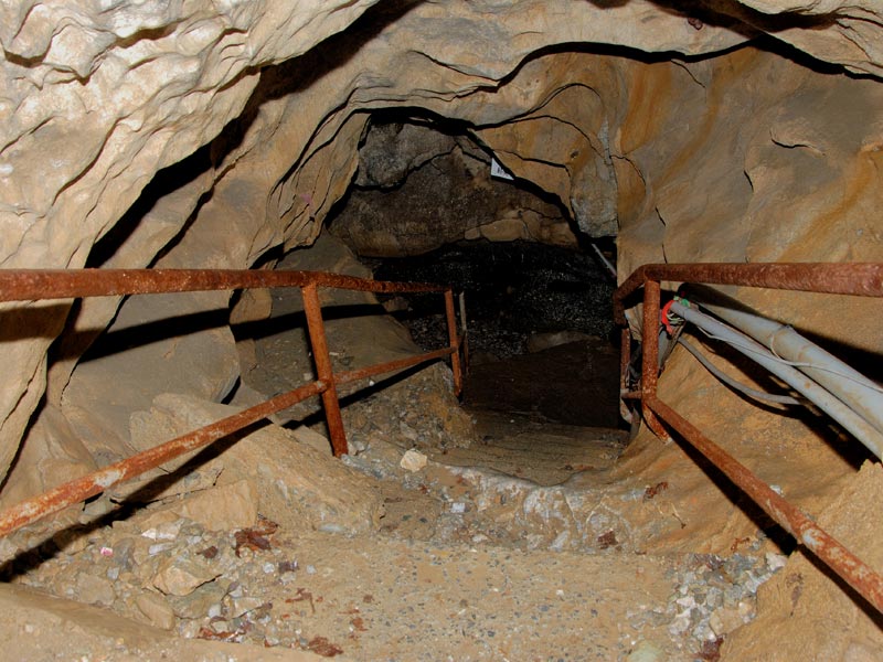 | 入口から入ったとたん、「がつん」とヘルメットをぶつける。すごく天井が低くい。なにせ重いカメラを首に掛け、バックを肩に三脚を持っての腰かがみの姿勢なので不安定きわまりない。何度もがつんがつん、そして意外と滑るのです。それも洞窟内のうん億年前の岩盤ではなく、せいぜい20年ほど前の(以前に来たときは確か無かったと思います)人工岩石が滑るのです。かなりコンクリートで歩道や橋を造っているが、この表面がざらざらして滑る。特にも斜面上の所は滑ります。靴は底の厚い登山靴だからなのだろうか、とにかく滑って怖いところが結構ありました。 |