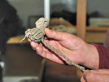 | 審判長が手にしているのが蘇民袋を切り取った口の部分(口前)です。口前とは蘇民袋の締め始めの部分で、この部分を最後に掴んでいた方が取り主になります。 側にいた方が教えてくれたのですが、口前は「女性のお産時に役に立つと言いますよ・・」と言うようなことを話してくれました。聞き違いであったら御免なさい。 この口前は、準取り主のグループの代表に手渡しされました。 |