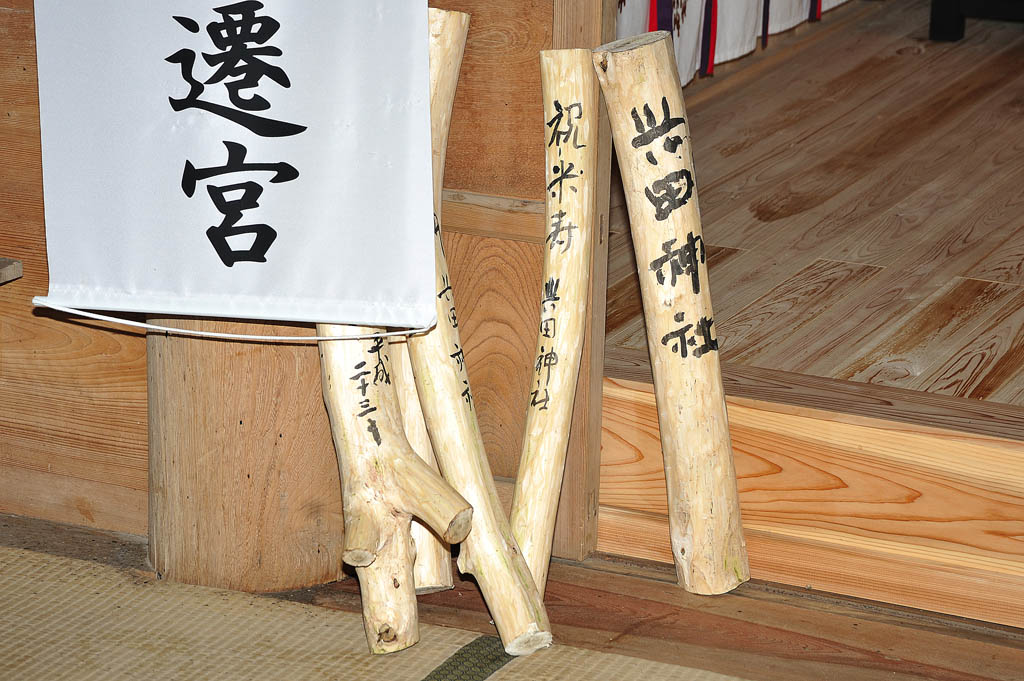 3:00過ぎ・・・ 食べながら色々な話が出てきました。そばにある巨大なご神木、「土の中に6m以上も埋まっているよ。この場所(本殿のある境内)を造るとき埋めて平らにしたから・・。660年以上かなあ、平泉にだってこんな大きな木は無いよ・・」と笑いながら教えてくれました。「ここは田舎の祭りだからね」、どうやら報道関係者と間違えられたらしい。 岩手の蘇民祭に書かれてあったことをお聞きしてみました。「悪口を言い合うとありますが、どんなことですか?」「そんなこと無いなあ、聞いたこと無いよ・・」と年配の方が言うのだから本当なのでしょう。「今聞こえている謡の中に、ケンカするなと言う意味のことがあるくらいかなあ・・」とのことであった。 |