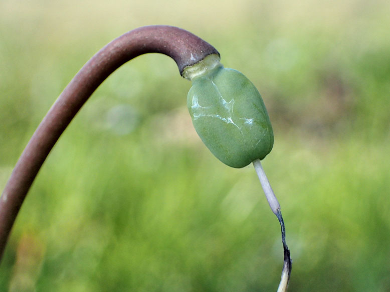 春先地上に花芽が現れます・・・ この時決まっていることは、地上に出る葉が必ず二枚あることで、葉の大きさには関係が無いようです。別の見方をすれば、いくら大きくて立派な葉であっても、一枚の場合は花芽が出てきません。 |