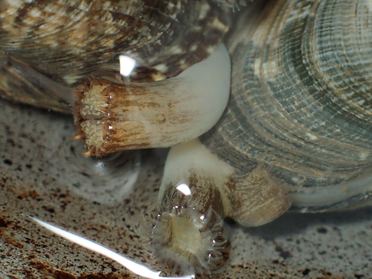 みそ汁でご馳走になる前(調理される)、水の中からべろべろと長い管(水管と言います)を出して居るアサリを見ていたら、マクロ撮影の試みをした私でした。水の中と外との両方の画像になるので、ストロボの光具合が違いますが、何とか使えそうな画像を選んでみました。