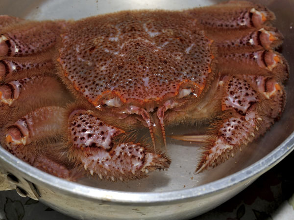布巾の上の毛ガニ、茹でていないのにかなり赤い色をしています。 布巾からはみ出し、画像としては最低ですがお許し下さい。 |