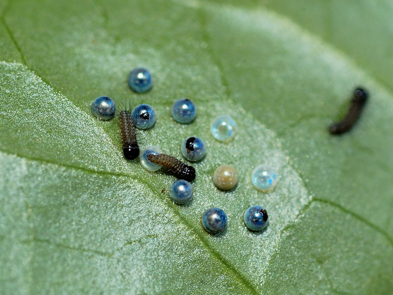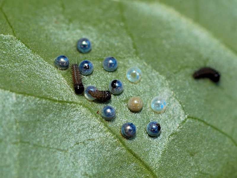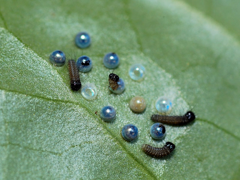 | ほとんど孵化が終わりずらりと勢揃いした幼虫達と、孵化後11日を経過した幼虫達です。6月の中頃には最終令の幼虫となり、やがて来春に向けての長いサナギの時期が始まります。12個生み付けられた卵ですが、果たして何匹の幼虫がサナギになり越冬できるのでしょうか。まもなく厳しい試練の時期が始まリます。 ここまでヒメギフチョウの撮影をすると、成虫の様子で飛び交ったり、カタクリに来る吸密の様子を撮影したくなります。これは来春の課題としておきます。 |