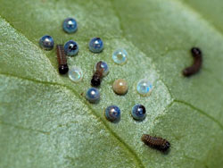 ヒメギフチョウの撮影は、幼虫からサナギへの変化とサナギから羽化へのシリーズを作成してきました。残るのは卵からの孵化の様子です。春になり可憐なカタクリの花が咲き出す頃、ひらひらと飛んでいるヒメギフチョウの姿が見られます。ウスバサイシンの葉の裏に直径1ミリぐらいの卵が生み付けられていますが、卵からの孵化の様子は、拡大撮影装置を使用しないと迫力に欠けます。 |