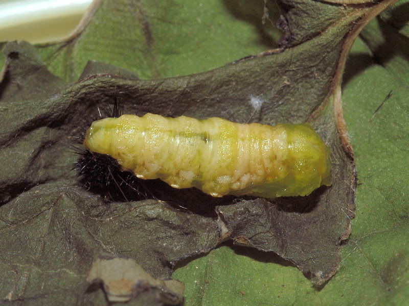 今年になって、越冬したヒメギフチョウ蛹からの羽化の様子、また卵から幼虫孵化の様子を撮影してきましたが、幼虫から蛹になる瞬間を去年は見逃していました。私には幼虫が身体に糸を架けて固定してから、どのくらいの時間経過後に蛹化するかのデータがありません。仕方ないので、そろそろだと思う辺りに観察を継続するだけでした。 やっとの事でしたが、二頭の幼虫が糸で身体を固定し蛹化の状態に入った個体を見つけ、待ちかまえていたのですが一晩そのままの状態でした。朝になって見ていたら、動かなかった幼虫が少しずつ動き出しました。頭の方の体節が少し伸びてきた感じがします。体長20.5ミリぐらいでしたが、全然変化がありません。ちょっとの間でしたが外仕事をしてきたら、見事に失敗で二頭とも完全に蛹化していました。 |