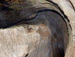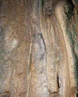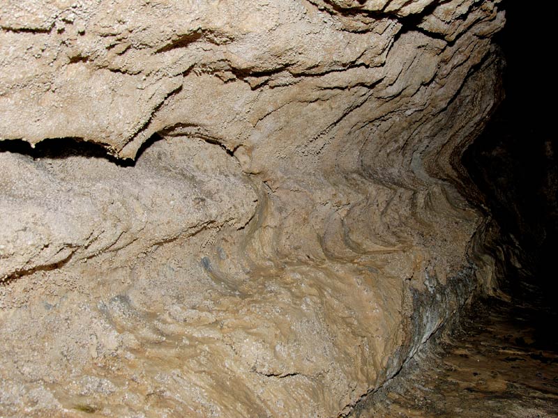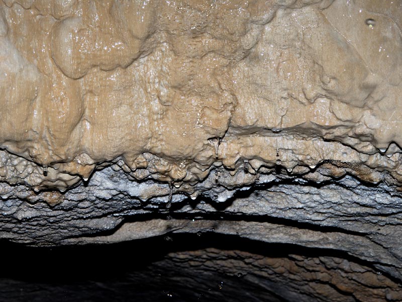 これはノッチと呼ばれる部分です。洞内を流れる地下水が、長い間一定の高さで留まると、その部分の石灰岩が多く溶かされ壁面に水平の凹凸ができます。これは、鍾乳洞の年代を決定するのに大きな役割を演じており、一つのノッチの中にも小さな凹凸がいくつもあると言われます。 |