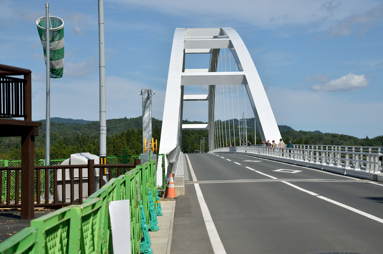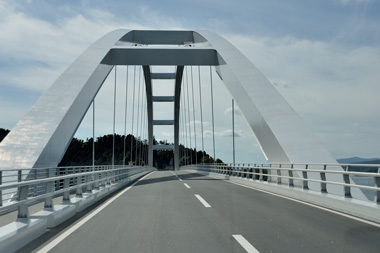 | 最初でもふれましたが、実際に走ってみて、これほど遠いと言うことと、迷い道だらけで気軽には行けないことが分かりました。とにかく橋の入り口までが迷路のようで遠すぎるのです。橋の両側には車を置ける駐車場が整備中であり、まだ少し時間がかかるようです。大島側の駐車場が完成すると、見学するための高い場所がありますのでゆっくり過ごせると思われます。 私は、大島側の駐車場から横断歩道を渡り、橋に設置されてある東側の歩道を半分以上歩いてみました。橋の全長が356m程ありますので、半分歩くと言ってもかなりあり、戻ってくる分を加算すると大変な距離になります。 ここでは行きと帰りに分けて編集し、助手席の息子に橋の上を通過しながら様子を撮影してもらいました。フロントガラス越しと言うことと、逆光線気味である事等で色具合が気になる部分があります。この点はご容赦ください。 気仙沼大島大橋(鶴亀大橋) 気仙沼大島大橋は、宮城県気仙沼市の本土と離島である大島とを結ぶ道路橋である。愛称は鶴亀大橋。東北初の離島に架かる橋。全長356m。最大支間長は東日本で最長の297m。 |