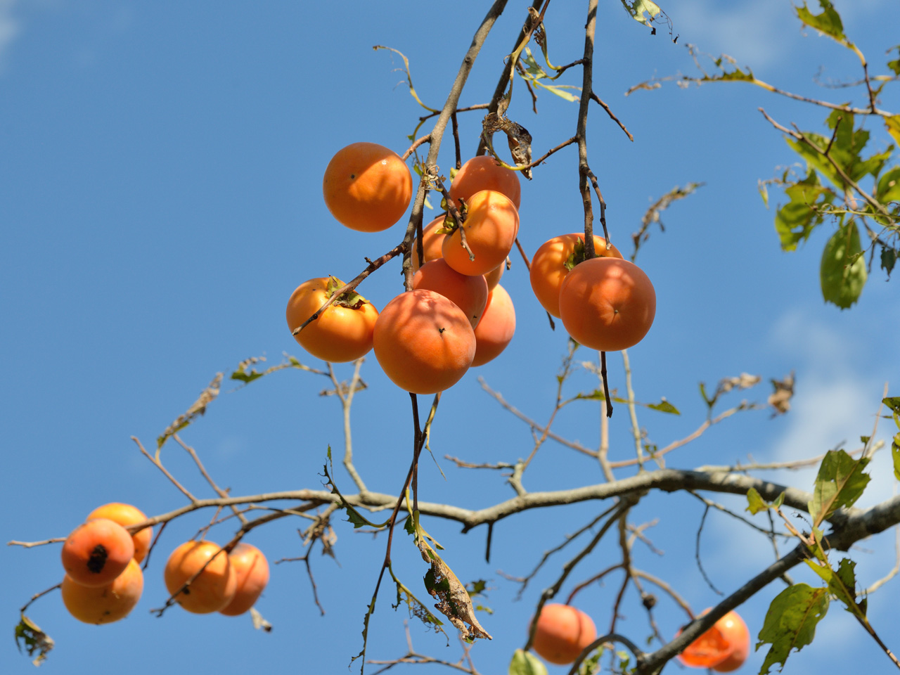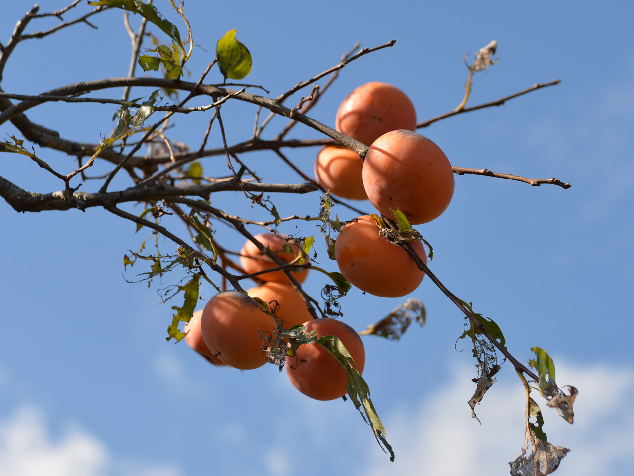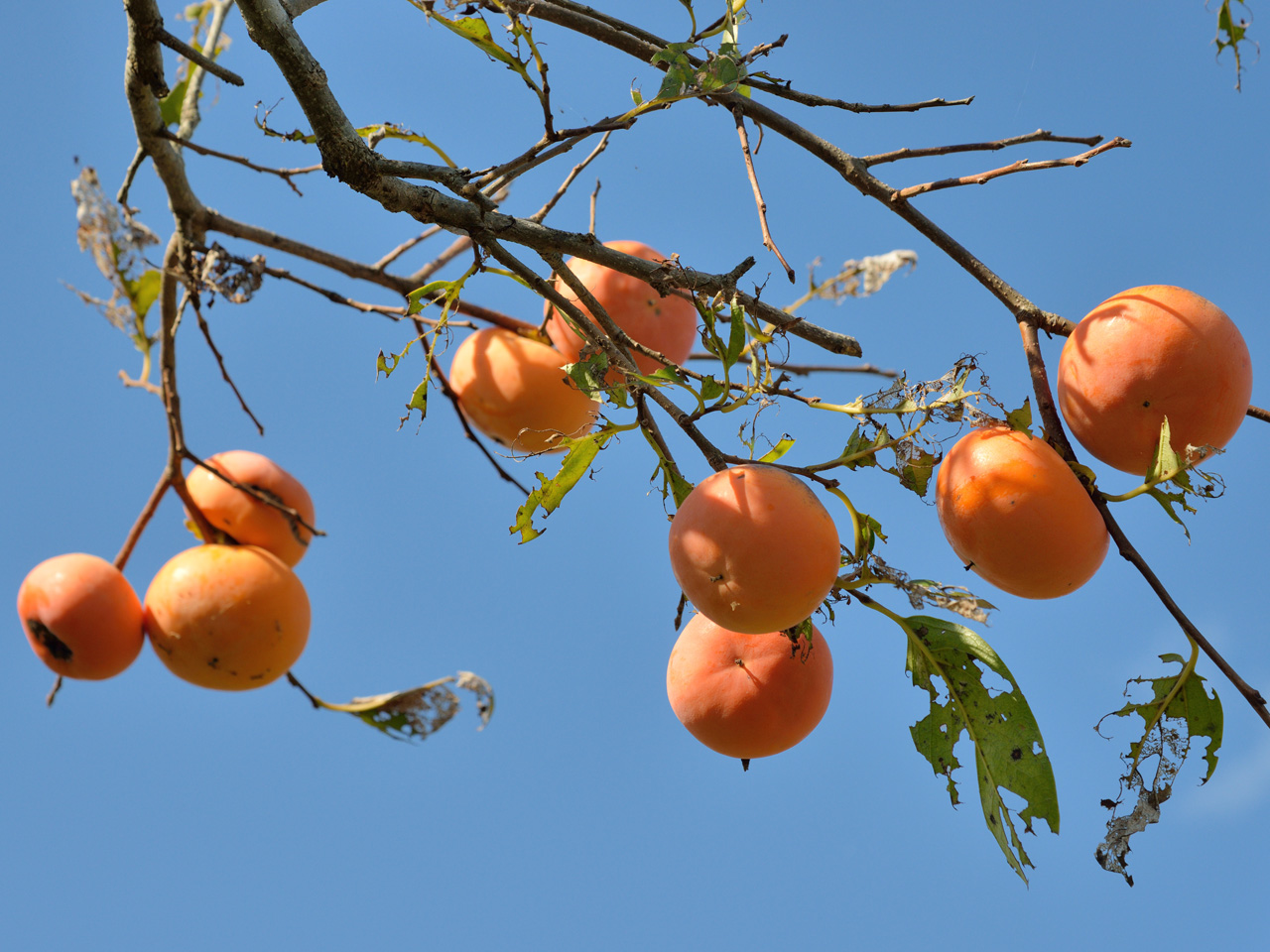 | location:uchinome.jpトップ>自然の表情>植物の表情に戻る>食べ頃に熟してきた富有柿 |