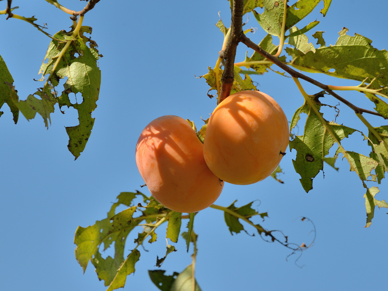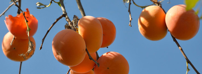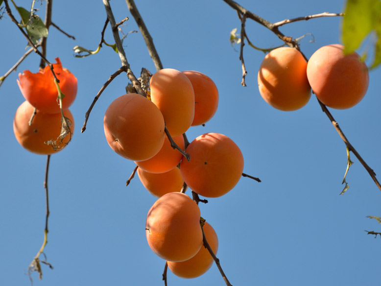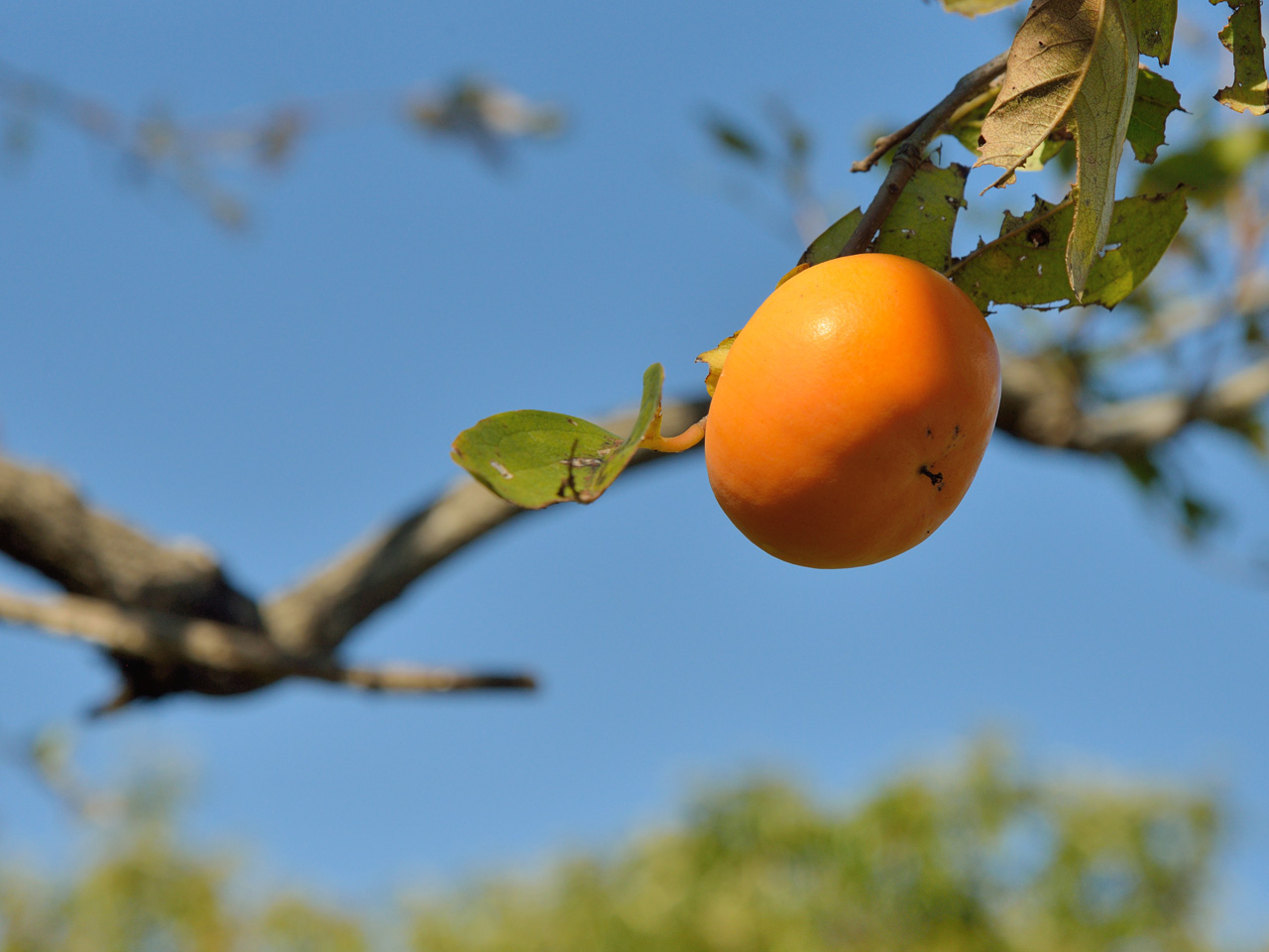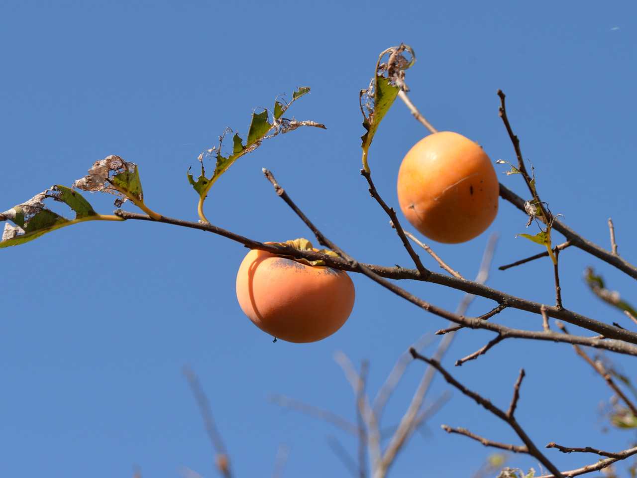 | location:uchinome.jpトップ>自然の表情>植物の表情に戻る>食べ頃に熟してきた富有柿 |