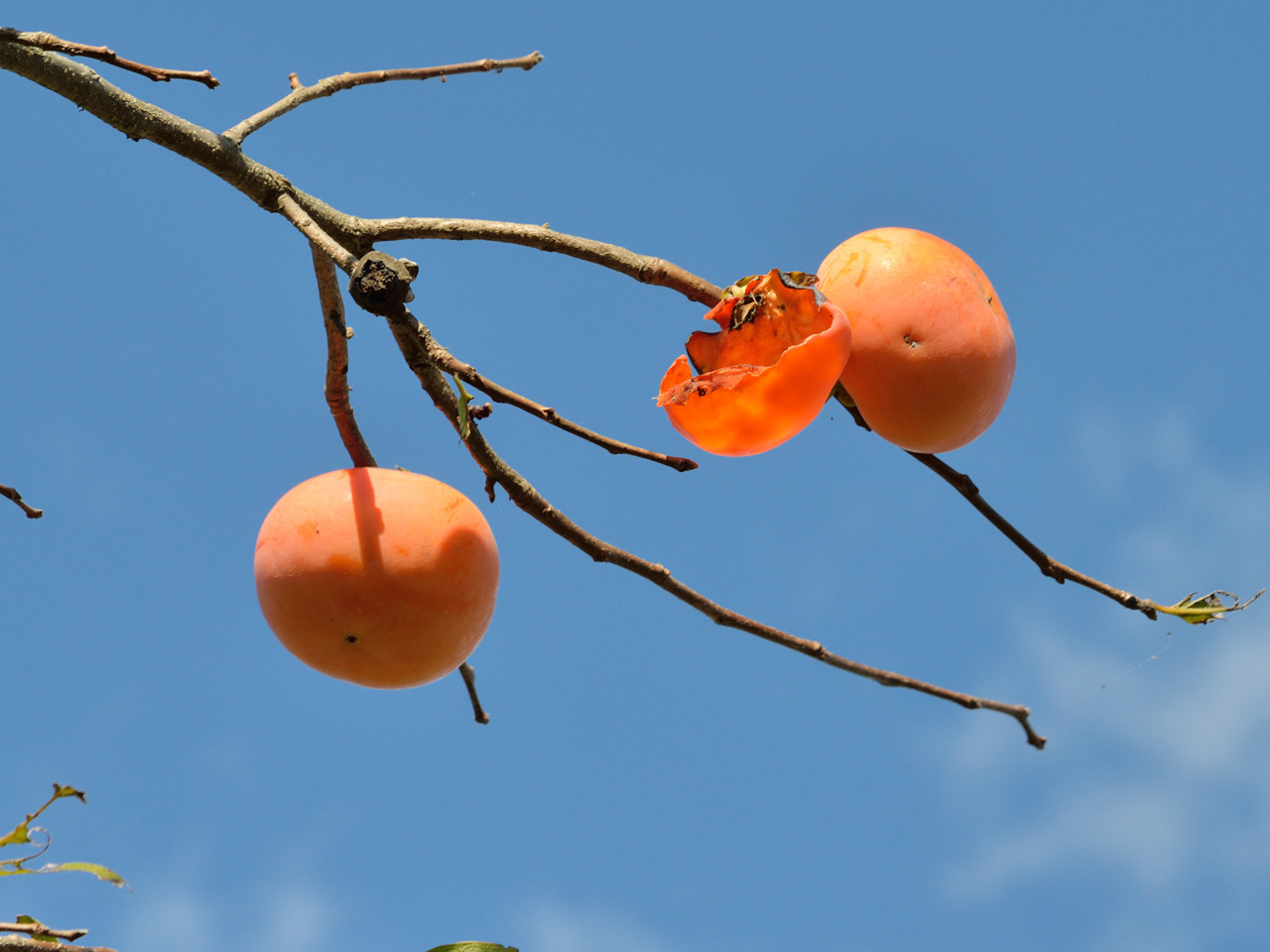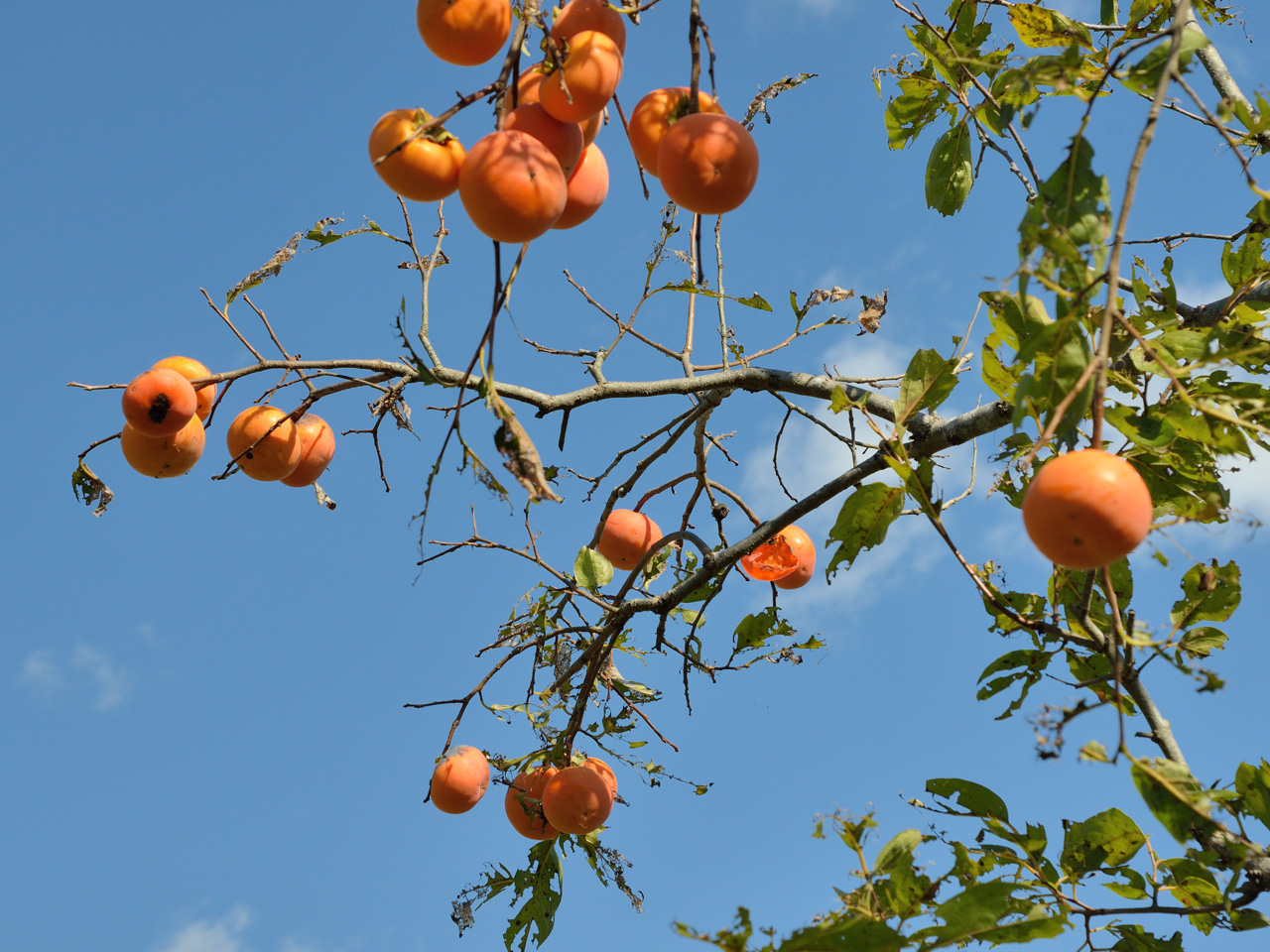 | おわりに・・・ 11月に入り冷え込むことの多い日が続きます。畑の柿の木の葉も落ちかかり、柿の実が見え始めています。まだあまり大きな木ではありませんが、富有柿の実が目立ってきました。私が食べる前に鳥達がつまんで食べている様で、きれいに皮を残して実の果肉をつまんでいるようです。 見る角度によって皮がきれいに残っていますが、そうでないと皮だけの柿の実になります。この画像はびっしりと実が集中している部分をまとめてみました。 |