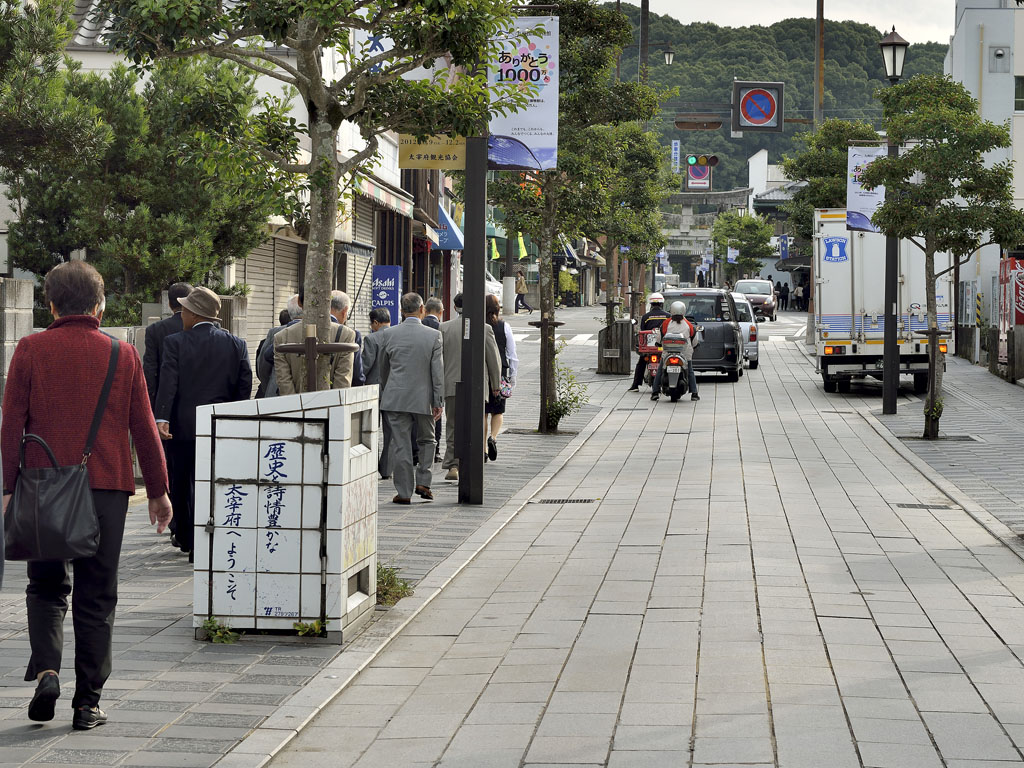 | 8:30 門前町・・・ 駐車場から真っ直ぐに伸びる門前町を歩きます。まだ早いこともあり、両側に連なるお店屋さんもほとんど開いていません。名物は「梅ヶ枝餅」とのことですが、何軒かの店から声がかかります。なにせ、往復で一時間ほどの予定ですから時間がありませんので、のんびりとお土産店に入る時間はありませんでした。 西鉄太宰府駅から降り立つと目の前に表参道、天満宮の境内まで繁る門前町が現れ、様々な店が軒を連ねます。出来たてアツアツの梅ヶ枝餅を売る店が実に四十軒をこえ、圧倒的に多く、「食べていかんね」の声を聞きながら賑わう参道を抜け、鳥居をくぐり神域へと続きます。 「梅ヶ枝餅」・・・ 太宰府天満宮の名物と言えば「梅ヶ枝餅」。もち米で作った生地の中に粒餡を入れて焼き上げた素朴な味わいが人気で、門前町のあちこちの茶店や土産店で販売されています。その起源は、浄妙尼という老女が菅公の御心をなぐさめるためにさし上げたとも、菅公薨去に際して霊柩に供えたものともいわれ、除災招福の霊験が伝わります。 (※頂いた資料・太宰府天満宮より) 残念でしたが、追いついて撮影することに夢中になっている私は食べそこないました。 |